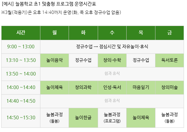 •  초1학년 맞춤형 프로그램을 희망하지 않는 학생은 같은 시간 다른 늘봄과정(돌봄서비스 등)에 참여할 수 있게 지원합니다.