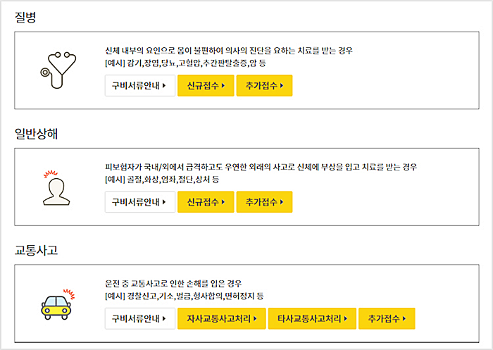 질병이나 상해, 화재, 도난, 교통사고 등으로 인한 의료비 청구는 온라인을 통해 간편하게 하실 수 있습니다. 청구 진행 상황을 실시간으로 확인할 수 있고, 보험금 지급 시 지급된 액수를 바로 알 수 있는 편리함이 있습니다.