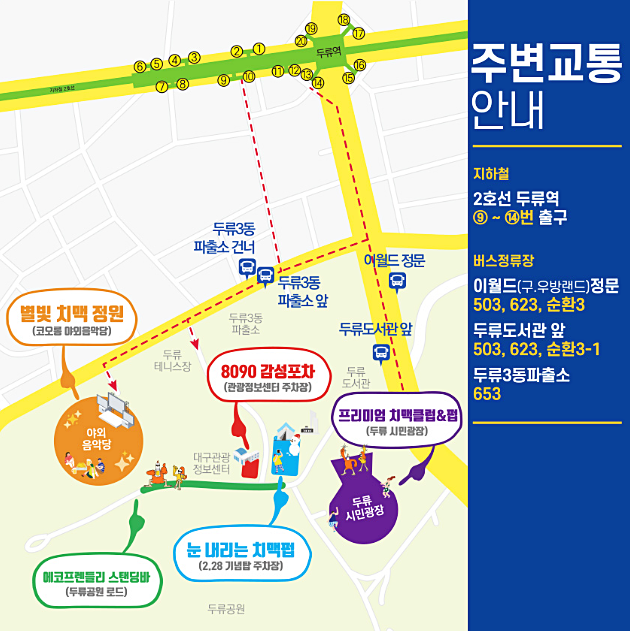 올해는 7월 3일부터 7월 7일까지 5일간 축제가 열리며, 대구의 대표적인 여름 축제로 자리 잡아 많은 사람들이 찾습니다. 축제가 열리는 두류공원은 대구의 대표적인 공원으로, 넓은 규모를 자랑해 많은 인파도 충분히 수용할 수 있는 장소입니다.