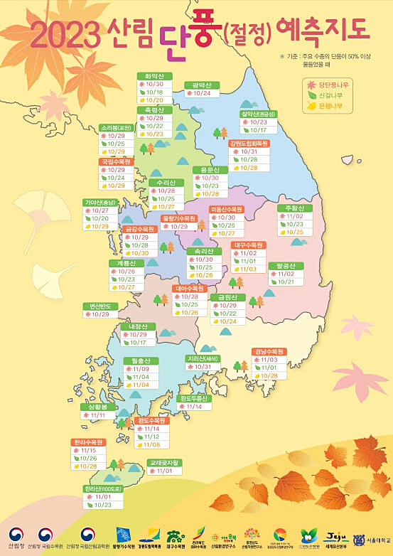 2023년 9월 25일, 산림청은 올해 가을 단풍이 절정에 이를 시기와 지역을 예측하여 공개하였습니다. 설악산은 10월 23일에, 중부 지방은 10월 19일부터 20일 사이에, 그리고 지리산과 남부 지방은 10월 20일부터 26일 사이에 단풍이 시작될 것으로 예상되고 있습니다.