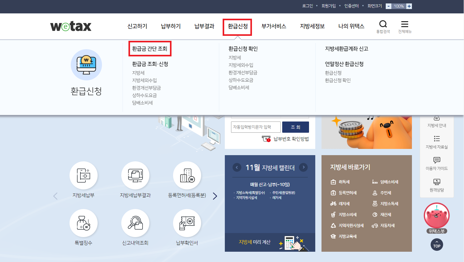 위택스에서 지방세 환급금 조회