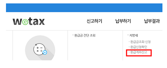 1. 위택스 메인에서 ‘환급신청-지방세-환급계좌신고’ 선택