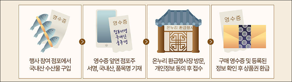 농축산물은 영수증과 교환권을 지급처에서 접수하면 되고, 수산물은 영수증 앞면에 점포주 서명과 국내산 품목명을 적어 환급행사장에서 접수하면 돼요.